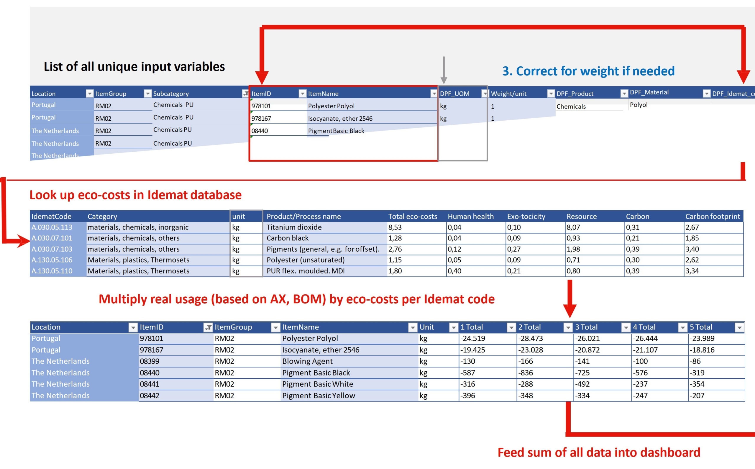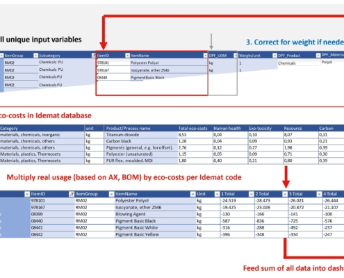 (2) Where possible, apply data which are readily available from your accounting (or ERP) system, and convert these data from euros to kilograms, liters, or kilometers by factors that are applicable to that year. The Idemat data in the tool are in IS units: m for length , s for time, kg for weight, MJ for electricity (in stead of kWh). So it is likely that you have to apply an extra conversion step.