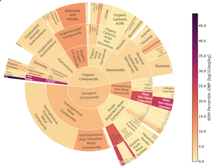 The Classyfire system gives the taxonomy (classification) of more than 1.1 million chemical substances. To make the system operational in LCA, the 400 chemicals (exothermic) in Idemat have been grouped in classyfire subsystems. Each subsystems has the same chemical type of building block (a sort of precursor), so it is assumed that the LCA characteristics (e.g. the carbon footprint) are similar within a classyfire subsystem. See the figure below.